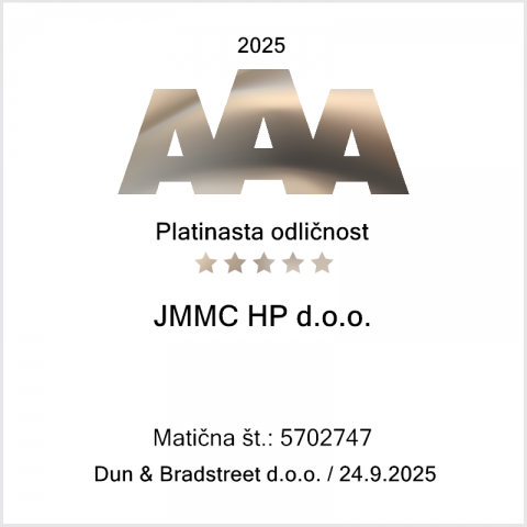Siamo lieti di condividere una notizia importante: JMMC HP d.o.o. ha ottenuto anche per il 2025 il certificato di eccellenza creditizia AAA (Platinum) rilasciato da Dun & Bradstreet. Il certificato viene assegnato sulla base di analisi e dati aggiornati e ha validità per i 12 mesi successivi alla data di emissione.